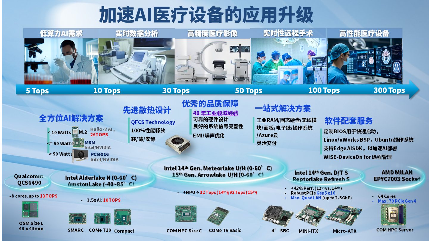 过去,CT、MRI、重症呼吸机等大型设备率先实现了数字化,如今AIoT成本普惠,让医疗影像+AI开启了广泛落地,越来越多的常见医疗设备加装“边缘大脑”,内窥镜、超声影像等应用掀起热潮。从高端医疗设备到常规检测设备,研华从诊疗场景规划产品方案,依据需求差异,匹配技术方案。
