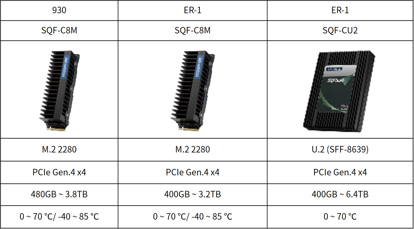 此外,SQF 930和ER-1系列可支持3次DWPD和1次DWPD规格,来满足各类工业需求。该系列还支持宽温工作(-40~85°C),以用于关键任务应用。最后,研华ER-1系列通过低功耗认证,符合当前ESG对高功率和低排放的期望。