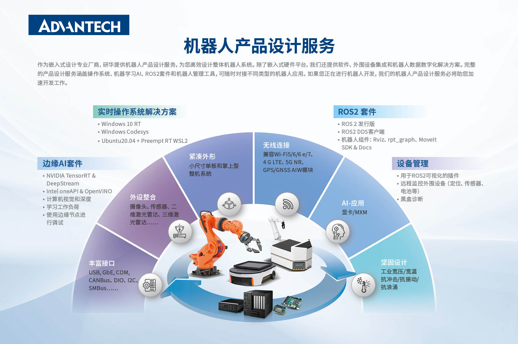 研华嵌入式物联网行业经理林思源告诉智次方·物联网智库,研华在机器人方面具有深厚的技术积累,在硬件层面,研华不仅可以为客户提供工业级的机器人硬件产品,甚至还能针对客户需求提供硬件预研,助力客户“领先市场一步”;在软件领域,研华追求实时性、稳定性和安全性,可为客户提供包含操作系统、软件移植、软件开发、算法整合、算法加持等一系列完整且丰富的支持和建议。