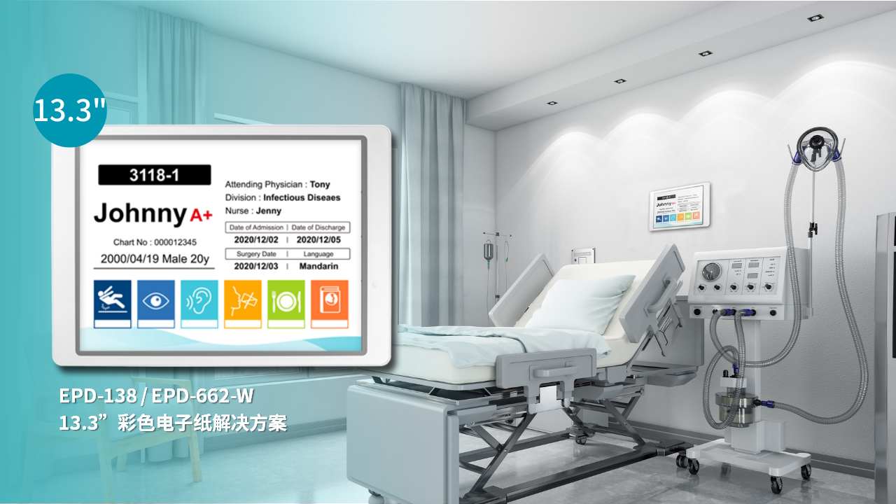 研华 EPD-138/EPD-662 13 英寸 Wi-Fi 电子纸显示屏采用了 E Ink Spectra™6 技术,能够提供鲜艳、高对比度的视觉效果,且无蓝光和背光辐射。这种解决方案适用于病床卡、标准操作流程(SOP)和仪表盘,将可持续性与便捷的内容管理相结合,有效提升了医院的运营效率和患者体验。