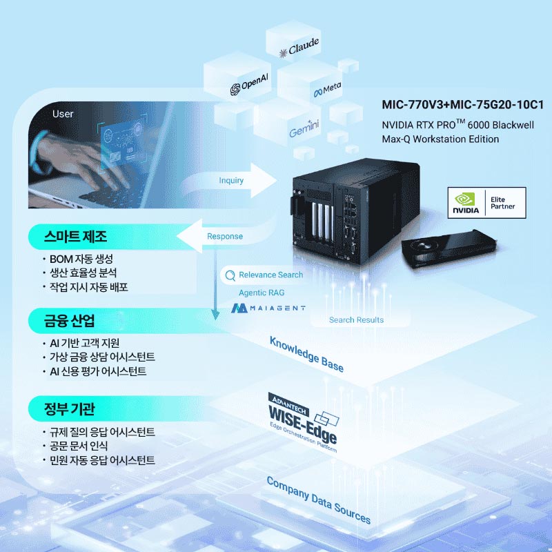 어드밴텍 GPU IPC 솔루션과 MaiAgent 소프트웨어의 결합은 높은 정확도의 모듈형 AI 에이전트를 제공하고, 빠른 설정과 시각화된 응답으로 다양한 산업 분야에 최적화된 구축을 지원합니다.